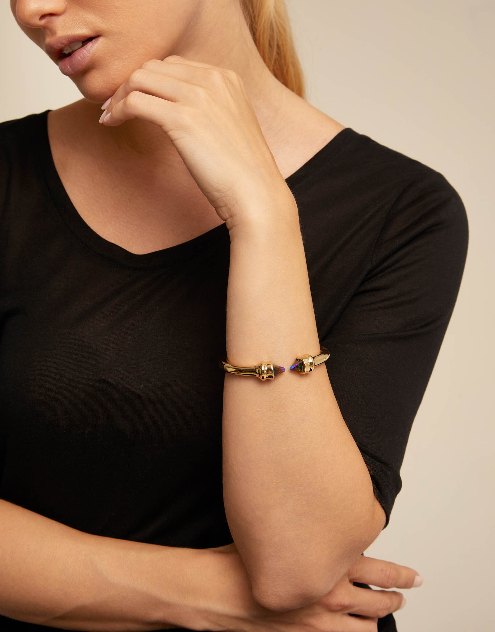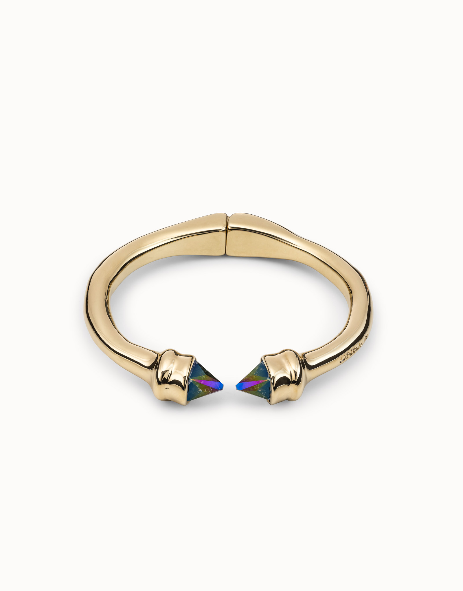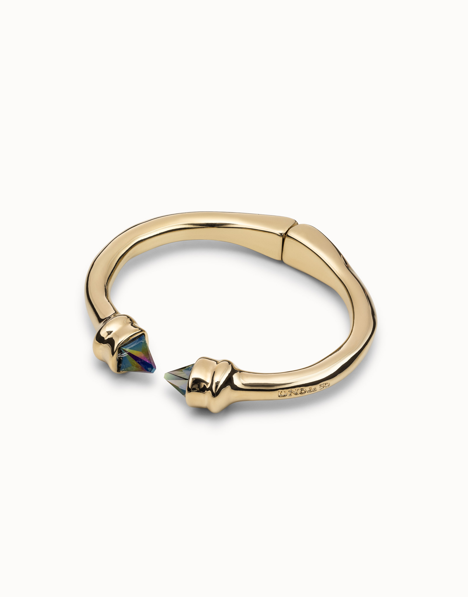 This bracelet, 100% handcrafted with the most rebellious woman in mind, will give a crazy touch to your most sober looks. It has an open design with two conical faceted crystals on the sides. Get a complement made in Spain by UNOde50. It is available in several sizes.
