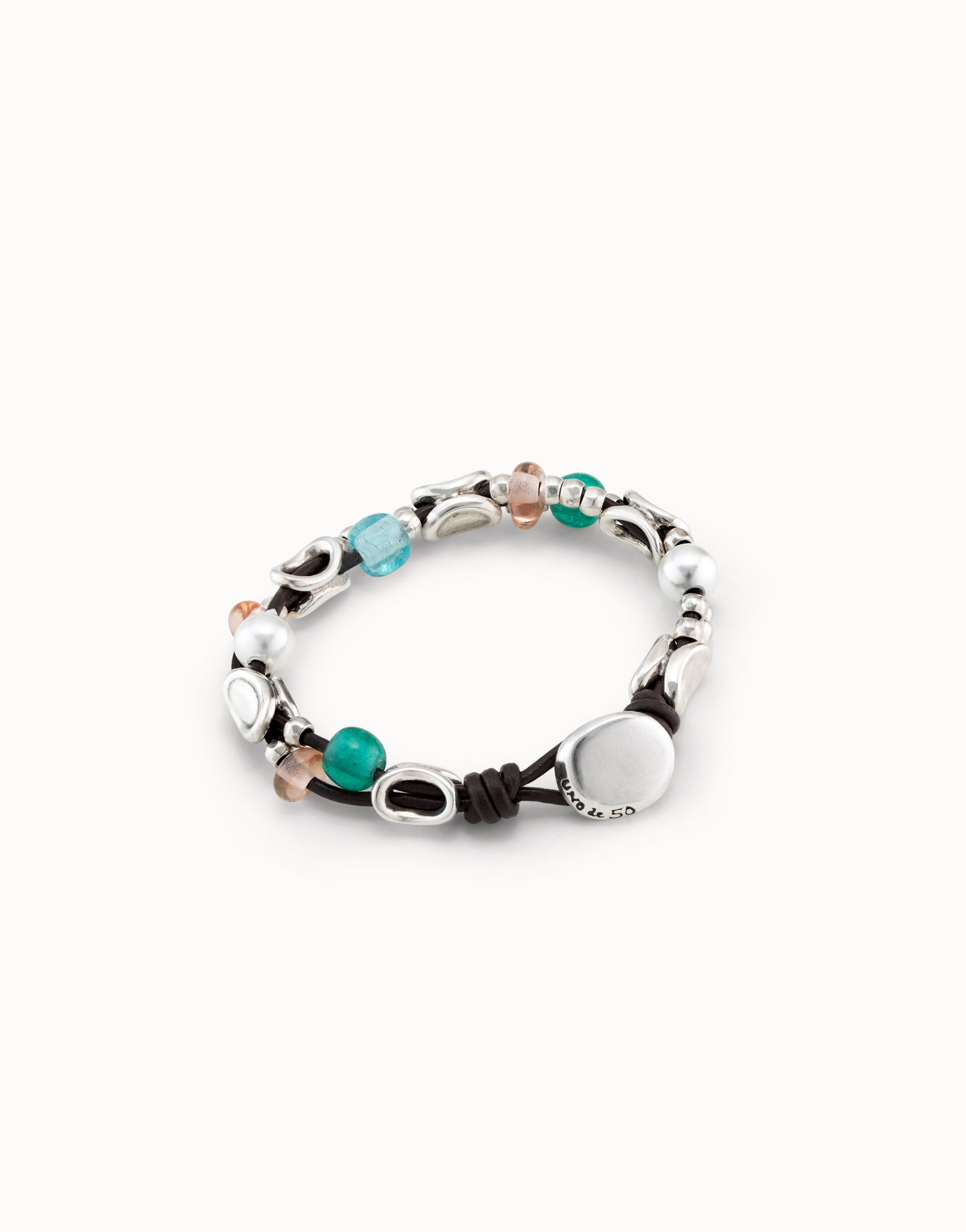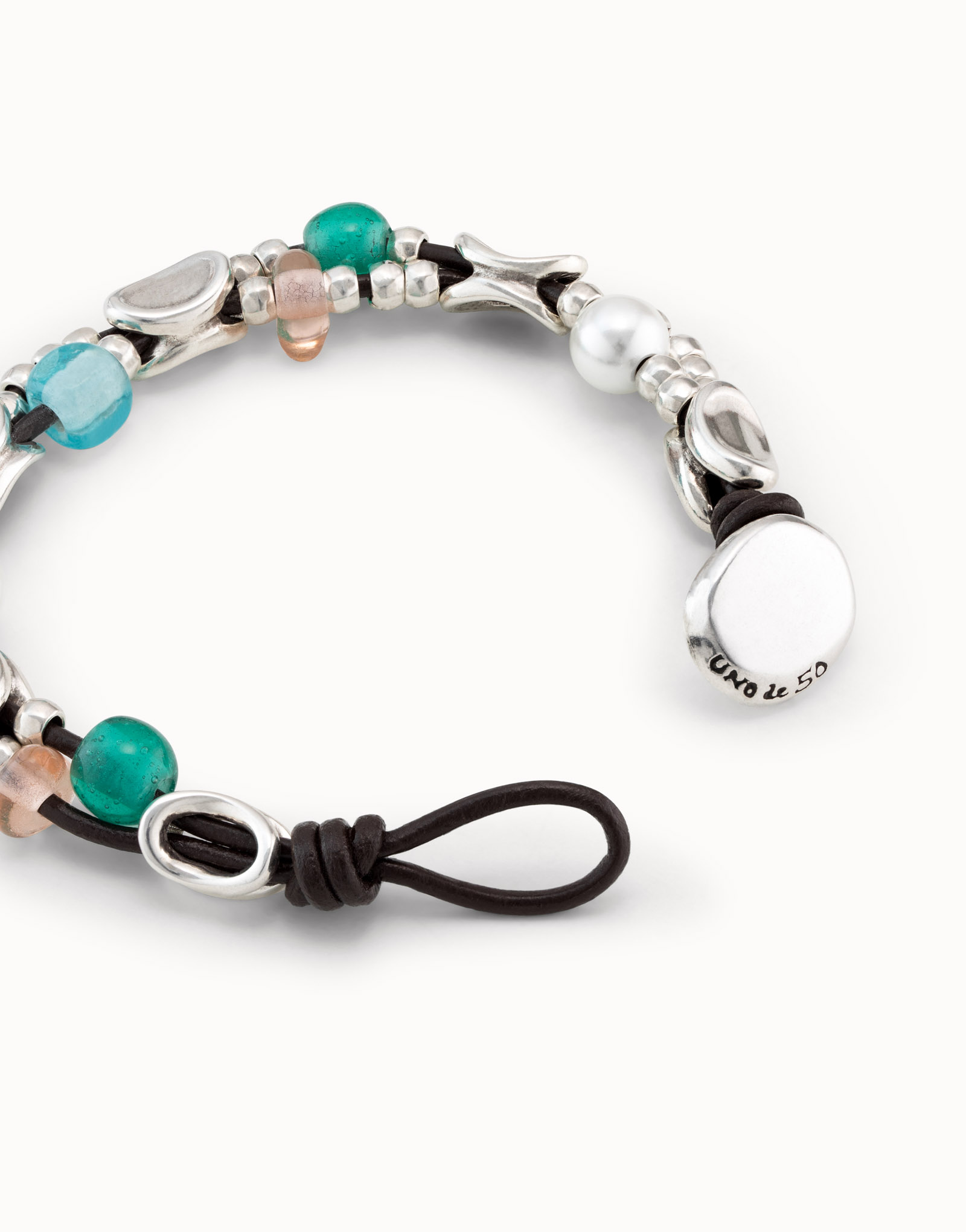 Sterling silver-plated bracelet with thin leather strips decorated with different silver links, crafted multicolored crystals and an elegant button clasp. Unique creation handmade in Spain.