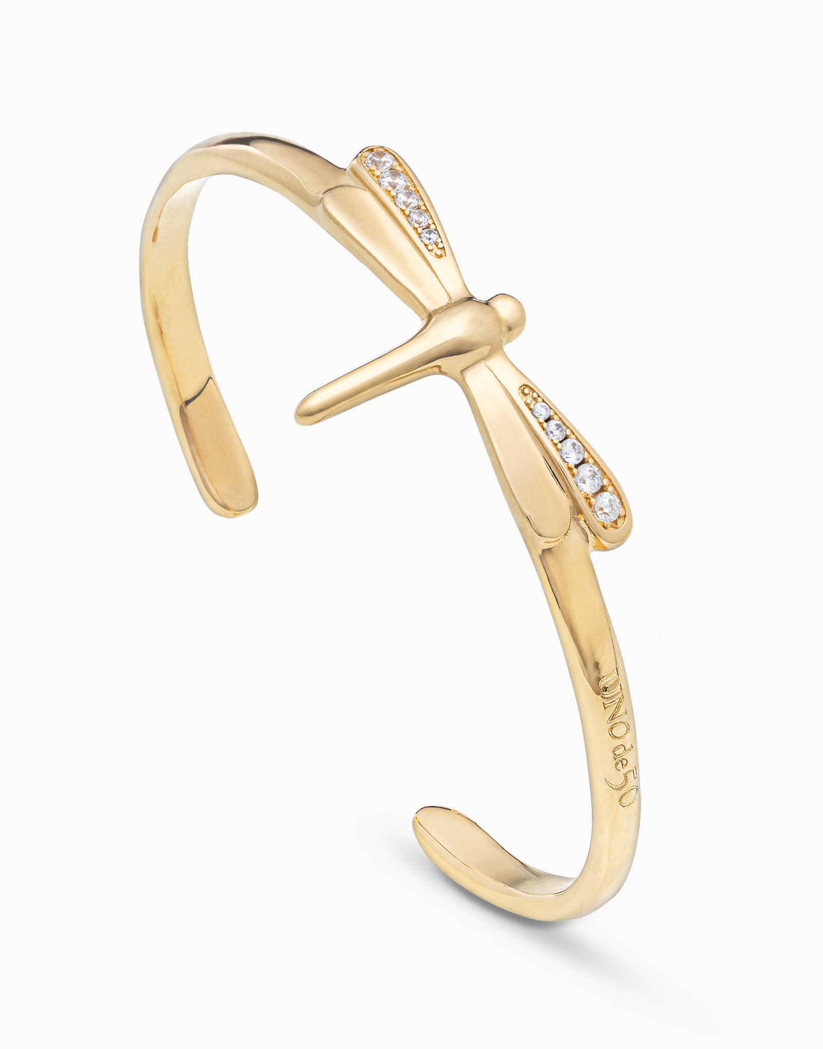 18K gold-plated bracelet with open design, starring a central dragonfly with topaz. This bracelet represents the essence of UNOde50 thanks to a 100% handcrafted process.