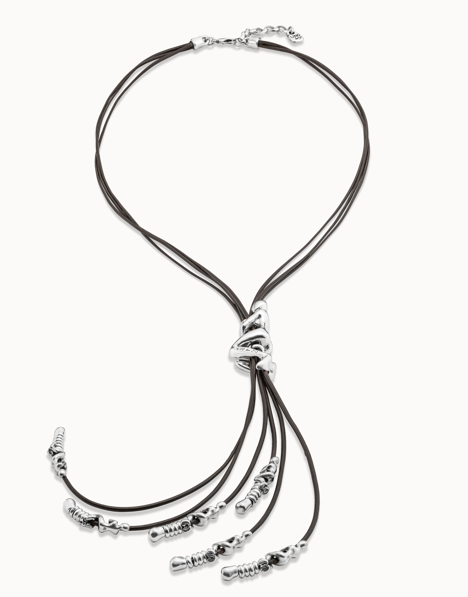 Long necklace made of dark brown leather cords with sterling silver-plated metal pieces at the ends. This jewel has been made in Spain under a 100% handcrafted process.