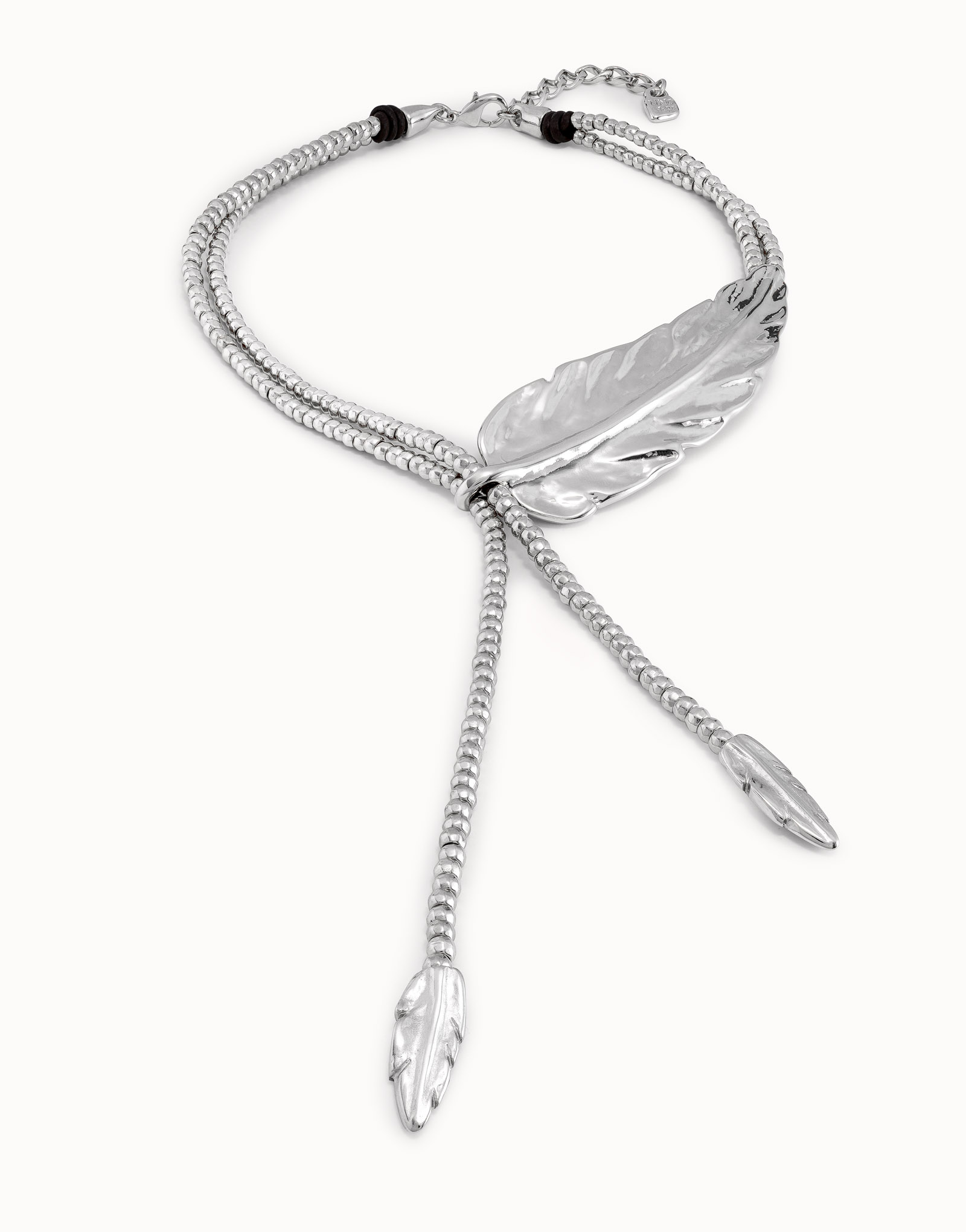 Long silver-plated necklace with small feathers. It includes a larger feather-shaped piece on the side, the protagonist of the Crush collection. An innovative design by UNOde50, 100% handmade in Spain.