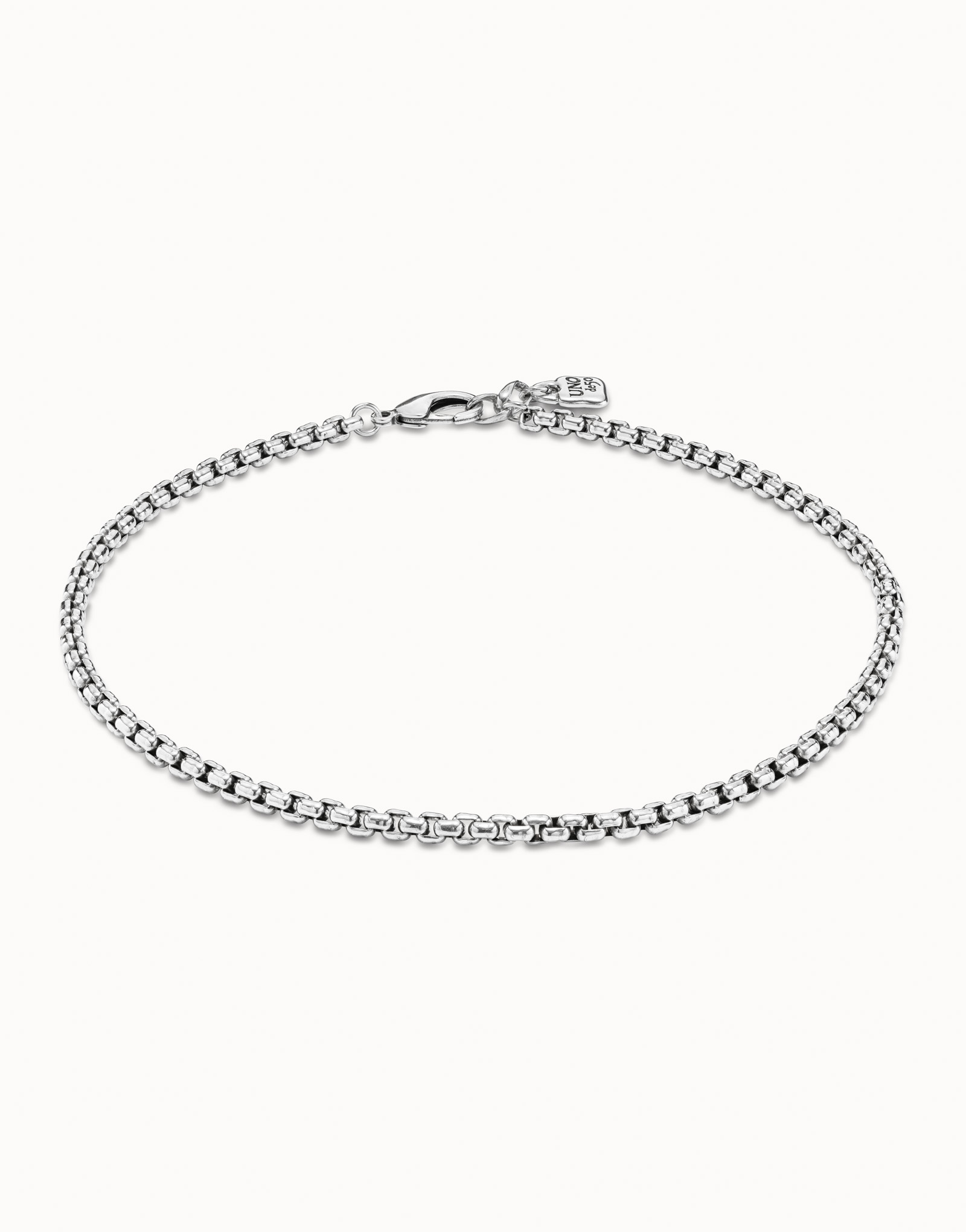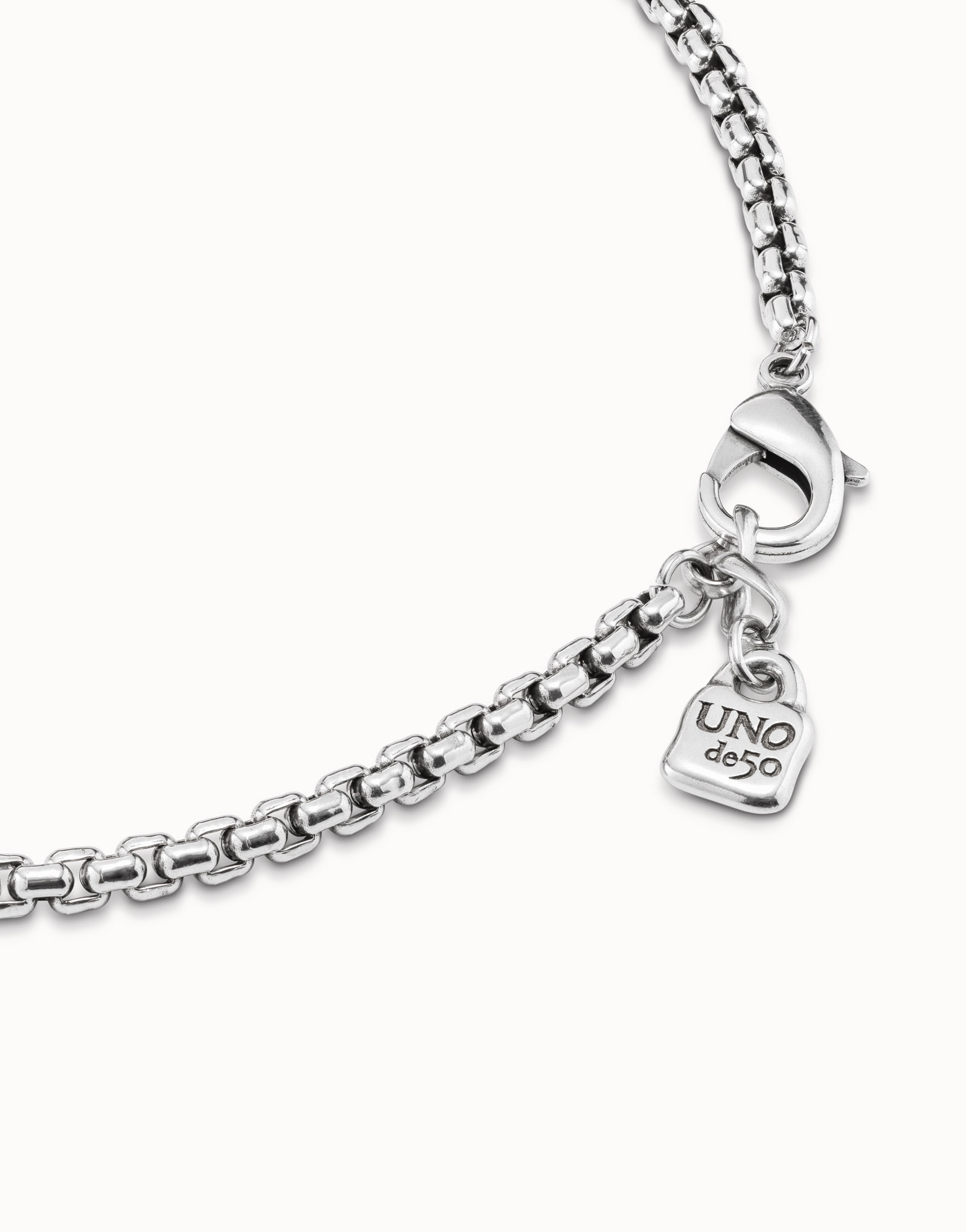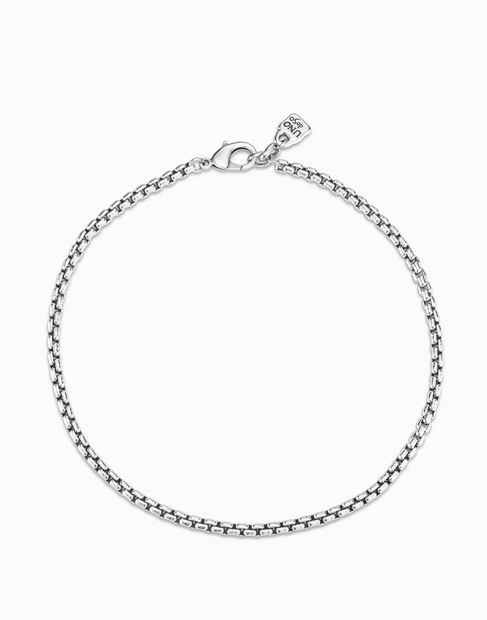 Flexible sterling silver-plated necklace with links forming a chain. It has a carabiner clasp from which the brand’s padlock hangs. This piece is 100% handcrafted in Spain by UNOde50.