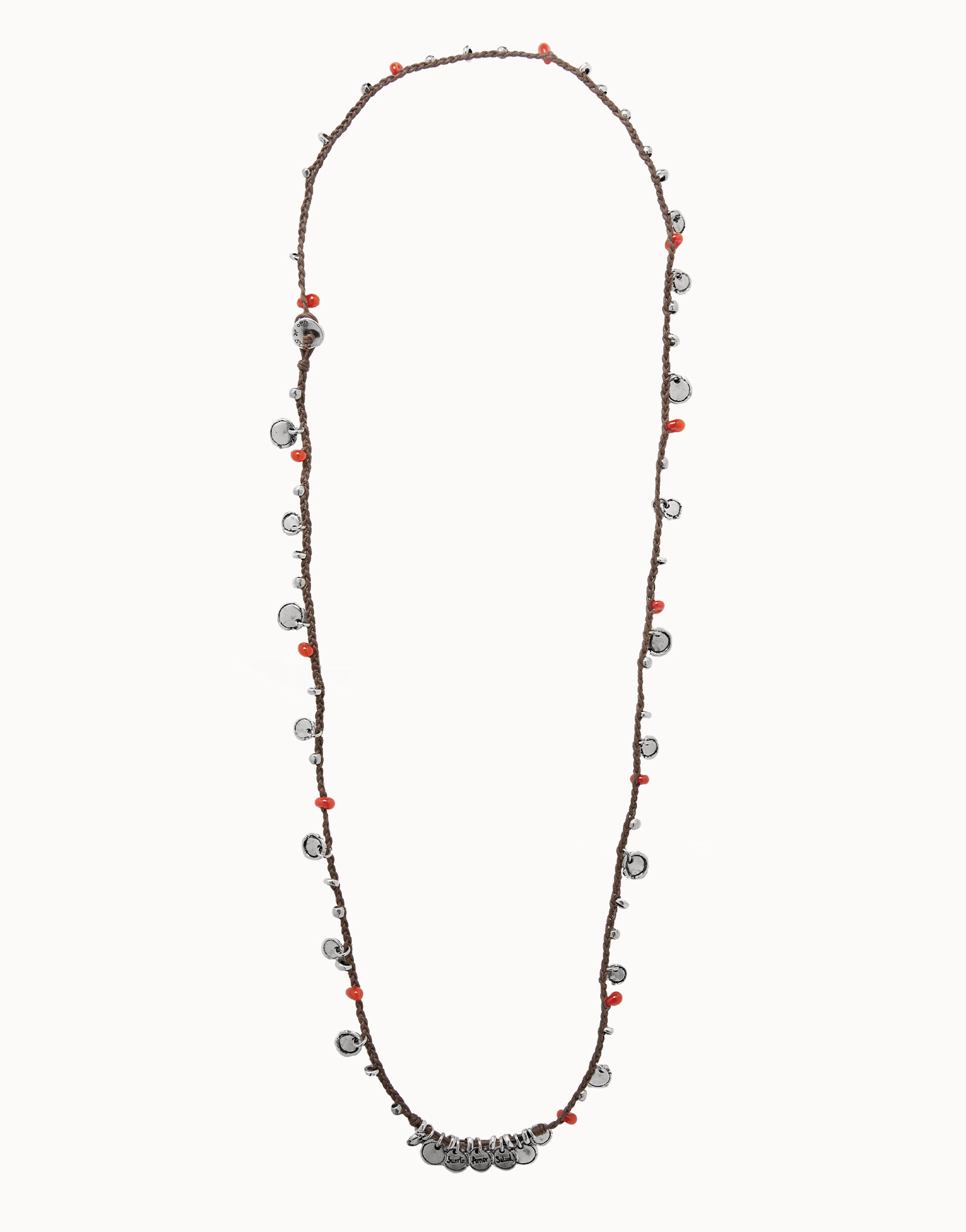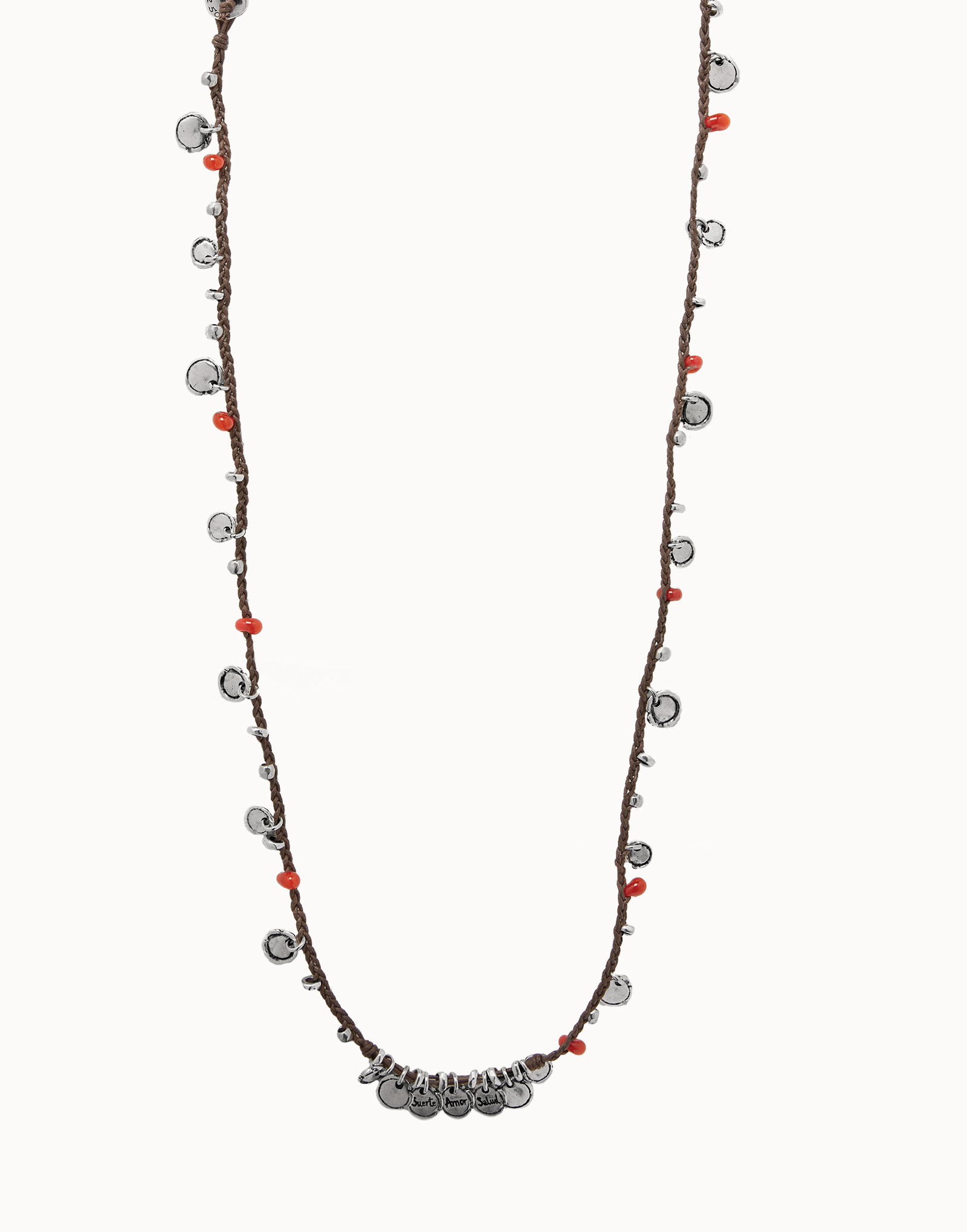 Long braided leather necklace combined with small pieces in the form of silver plated sealing waxes and handmade red crystals. Its length makes possible to turn it into a shorter double necklace. A creation Made in Spain and handmade by UNOde50.