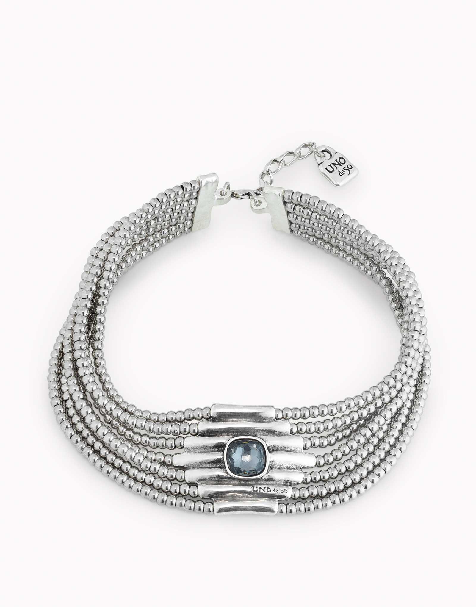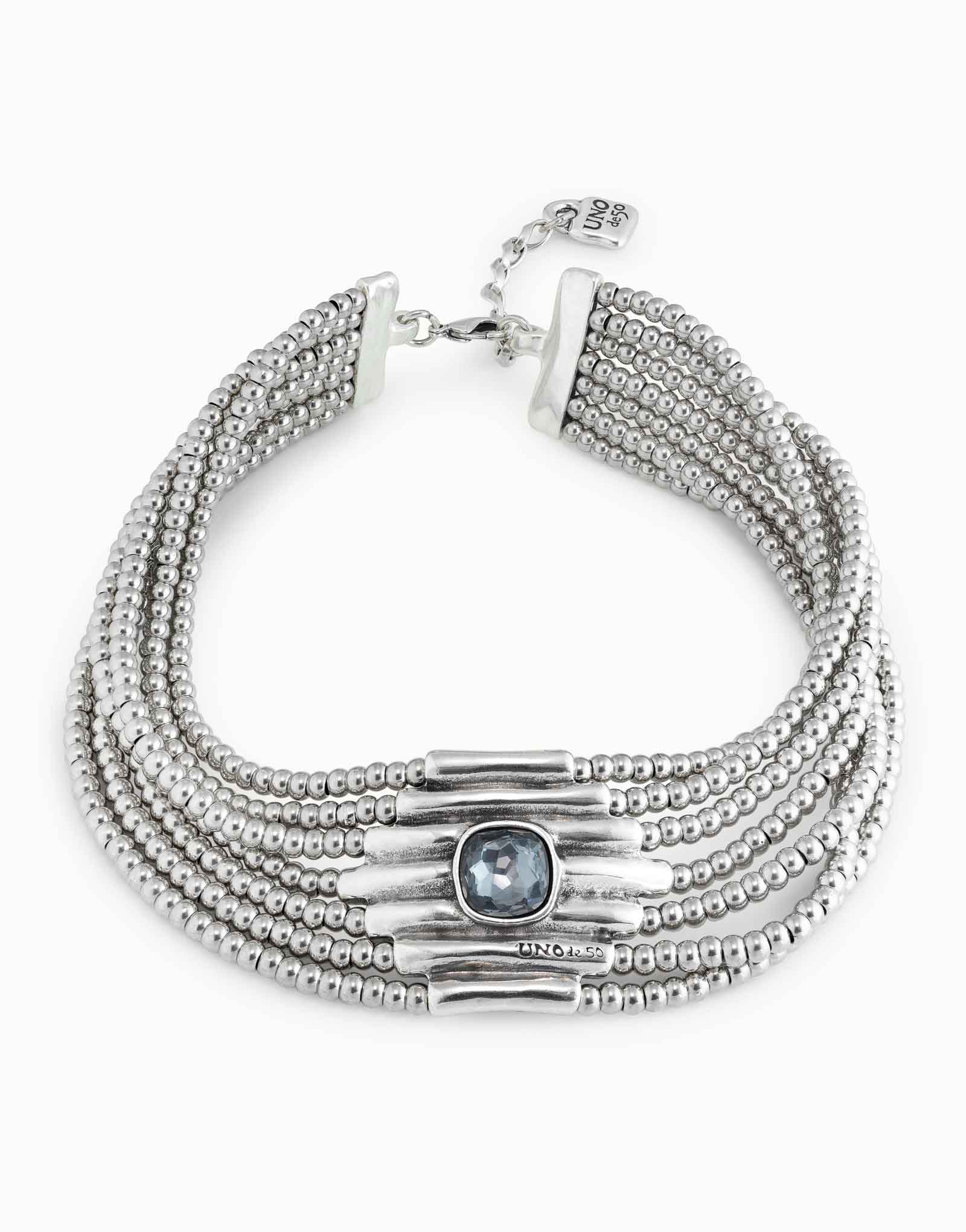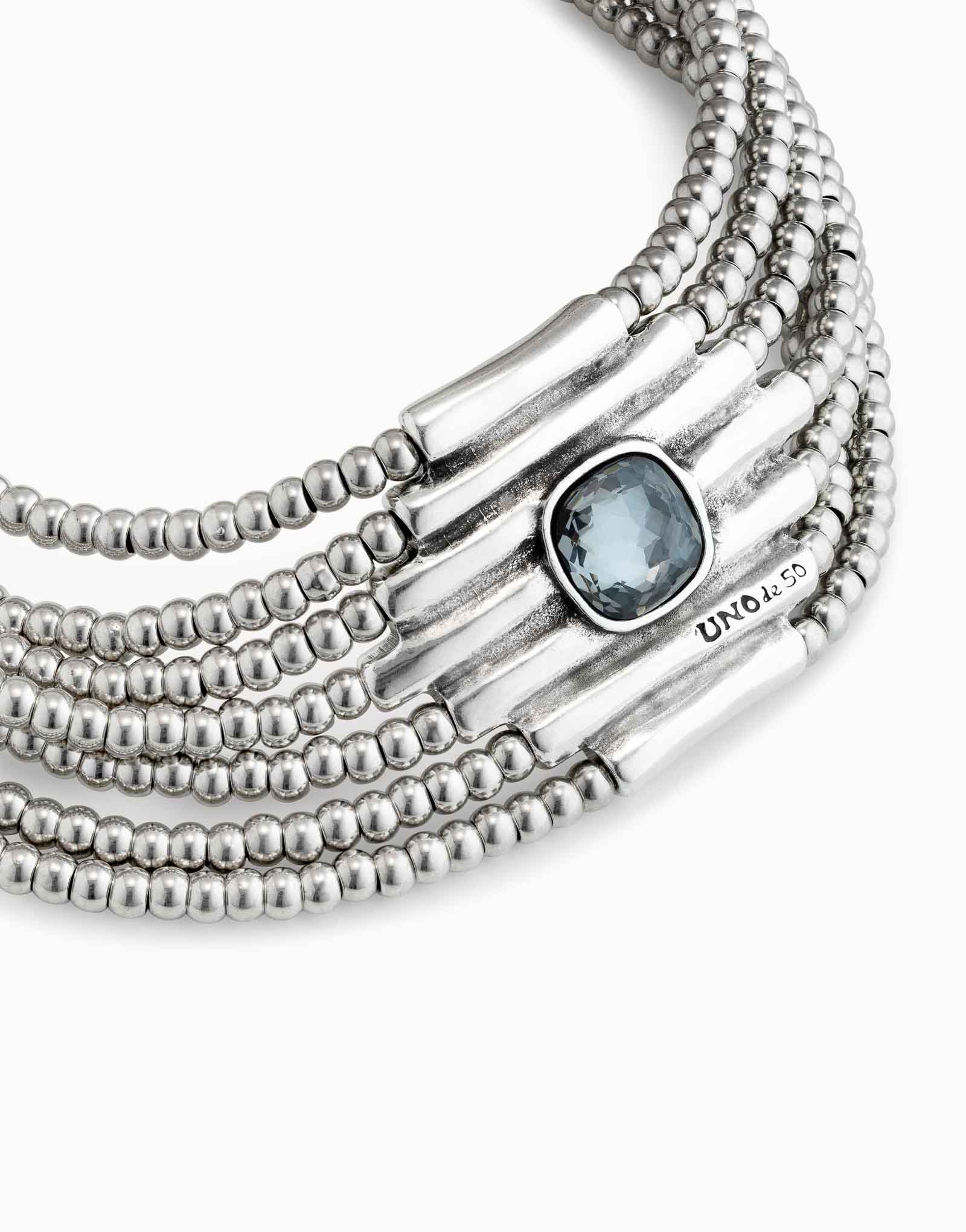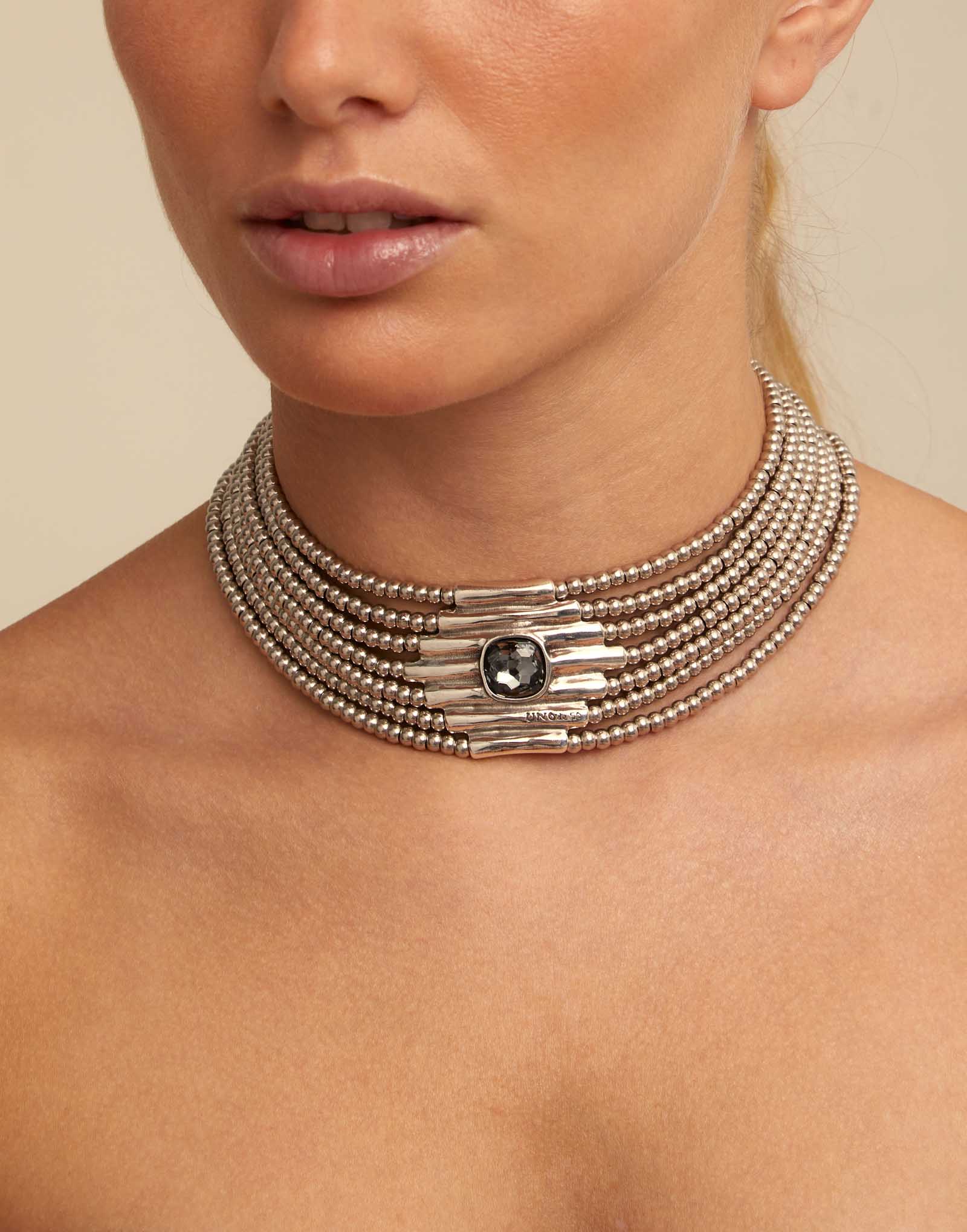 The Infinite necklace is seven beaded strands with a central piece featuring small cast tubes and a gray crystal. This metallic choker is entirely handmade in Spain using a silver-plated metal alloy. It features an adjustable clasp so you can tailor it to the desired length. Wear this necklace with other pieces from the Fearless collection.