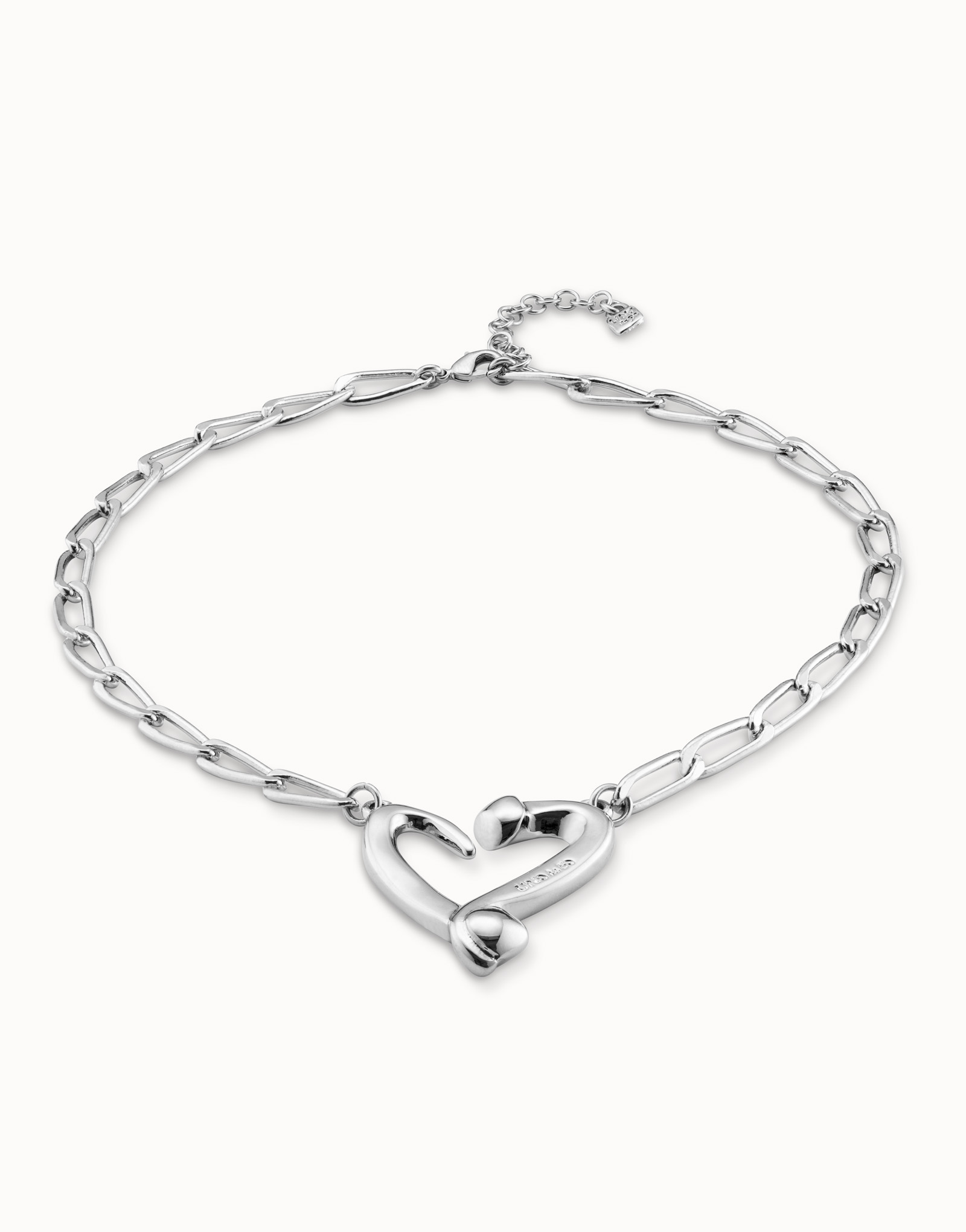 Sterling silver-plated necklace with thin nail-shaped links joined together and with a mid-sized heart in the center. 100% handmade in Spain with an adjustable clasp.