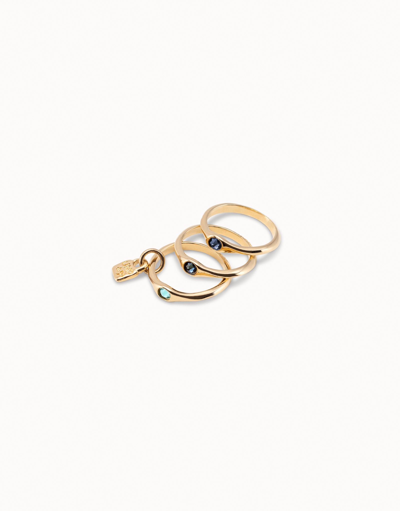 Triple 18K gold-plated ring with three blue Swarovski crystals. A design by UNOde50, handmade in Spain.